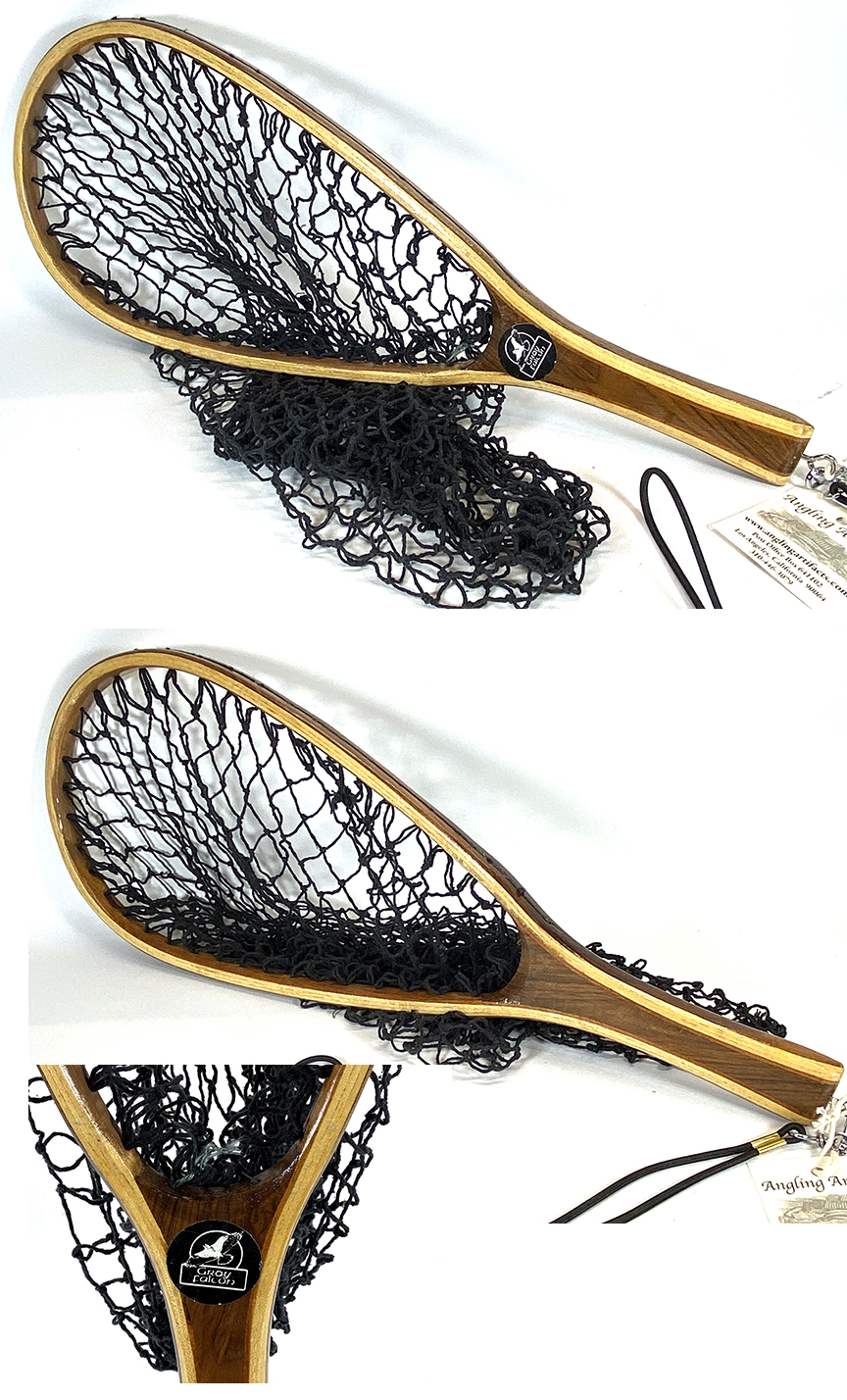 Beautiful steam bent "GRAY FALCON" landing net with original cotton netting! Measures approximately 20 1/2" long and 8" wide. Great original condition! Wood frame is ash or oak with walnut handle/bridge. Please click on its image to see additional pictures!